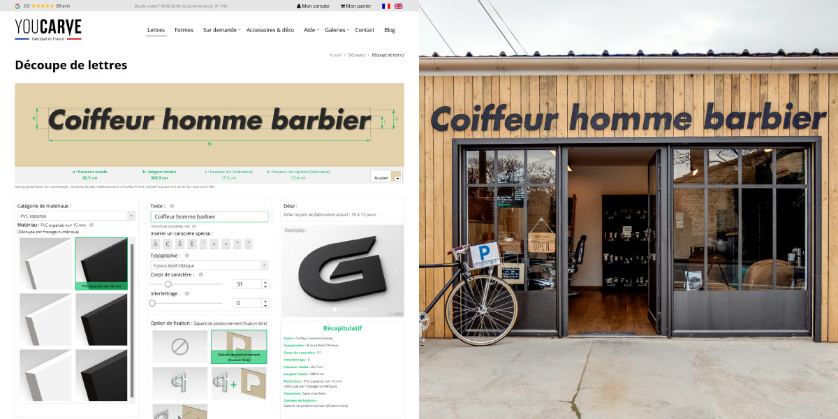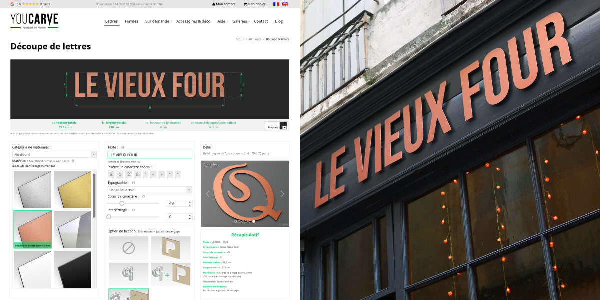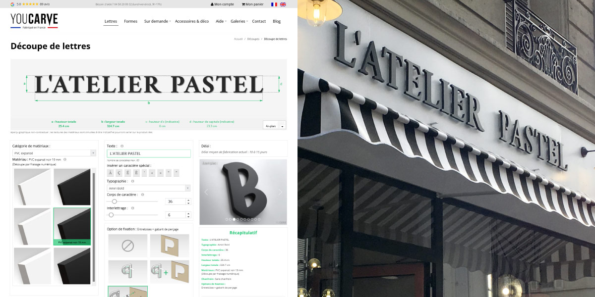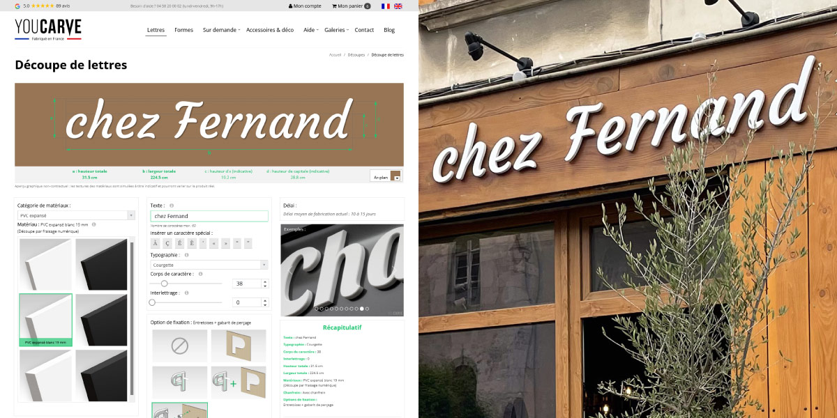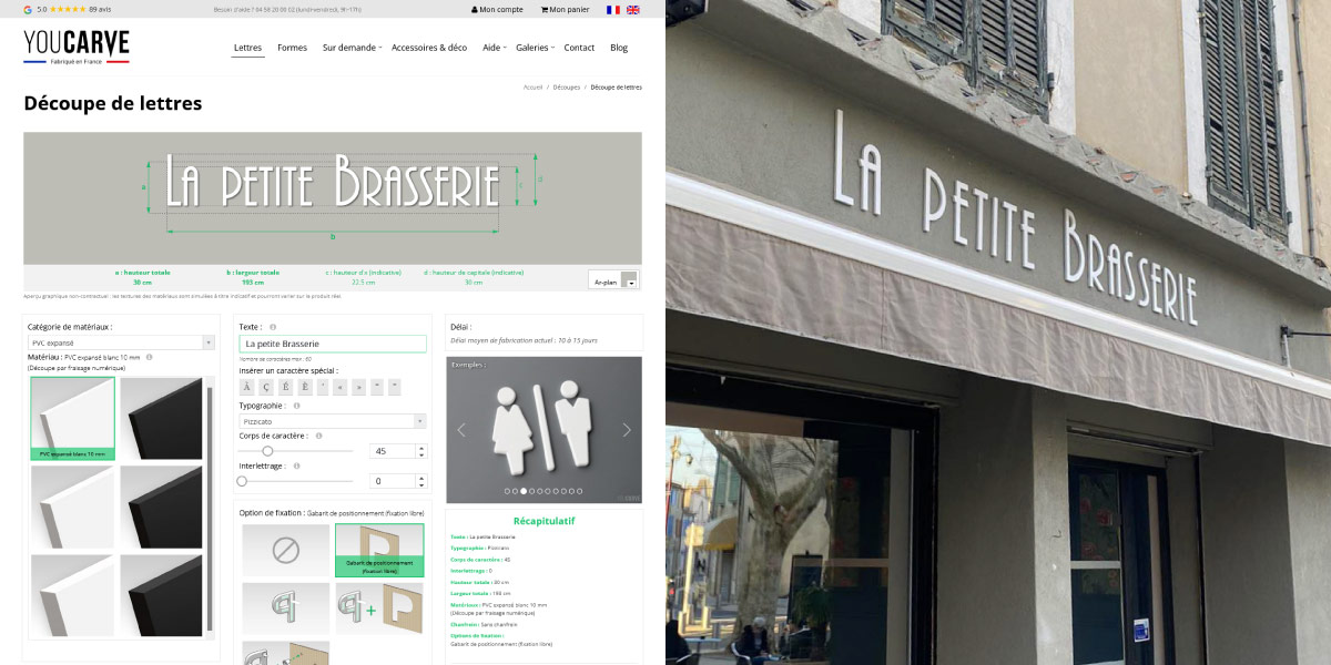 Youcarve offers a 100% online, custom-made, high-end solution at a very competitive price: you design your sign yourself, directly on the site, and receive your ready-to-install letters at home. The average budget for a sign in cut-out letters with Youcarve is less than €500, including installation template and fixings.