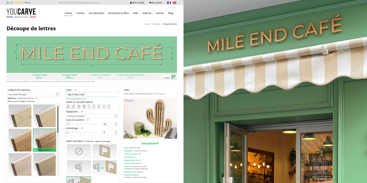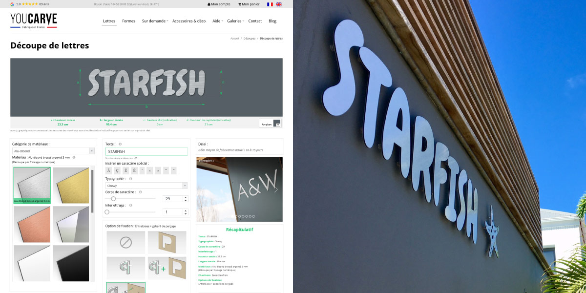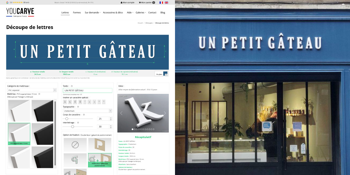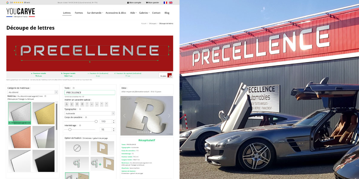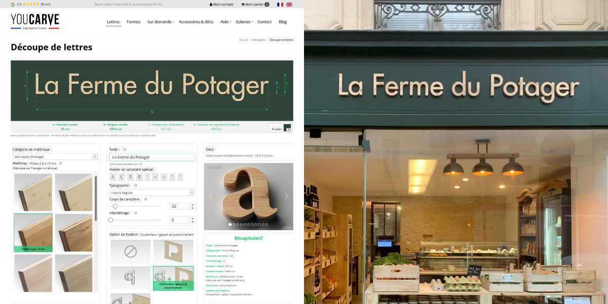 Youcarve offers a 100% online, custom-made, high-end solution at a very competitive price: you design your sign yourself, directly on the site, and receive your ready-to-install letters at home. The average budget for a sign in cut-out letters with Youcarve is less than €500, including installation template and fixings.