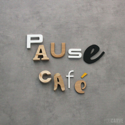 Composition créative de lettres de différentes tailles et matériaux (PVC expansé, aluminium dibond et bois).