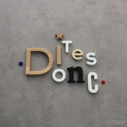 Composition créative de lettres de différentes tailles et matériaux (PVC expansé, aluminium dibond et bois).