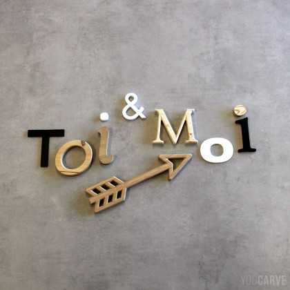 Composition créative de lettres de différentes tailles et matériaux (PVC expansé, aluminium dibond et bois).