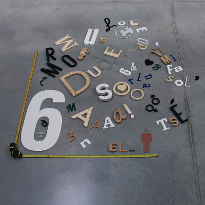 Sélection de lettres en vrac de différentes tailles et matériaux (PVC expansé, aluminium dibond et bois bruts).