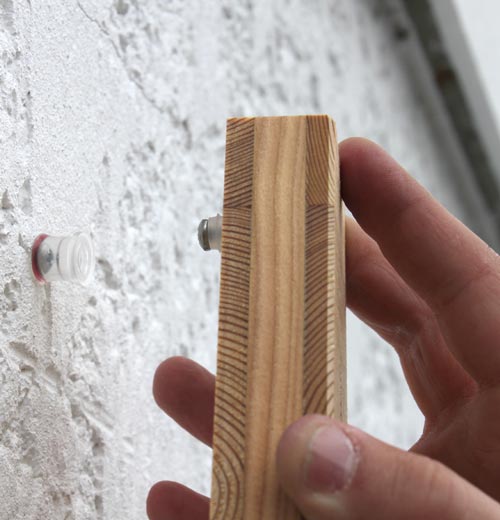 Les tétons sont positionnés et fixés par nos soins au dos des pièces. Nous fournissons également un gabarit de pointage en carton, qu'il suffit de positionner sur votre support afin de repérer et d'effectuer les perçages, puis de visser les douilles (fournies par nos soins, avec vis inox et chevilles universelles), et enfin clipser les lettres ou les formes.